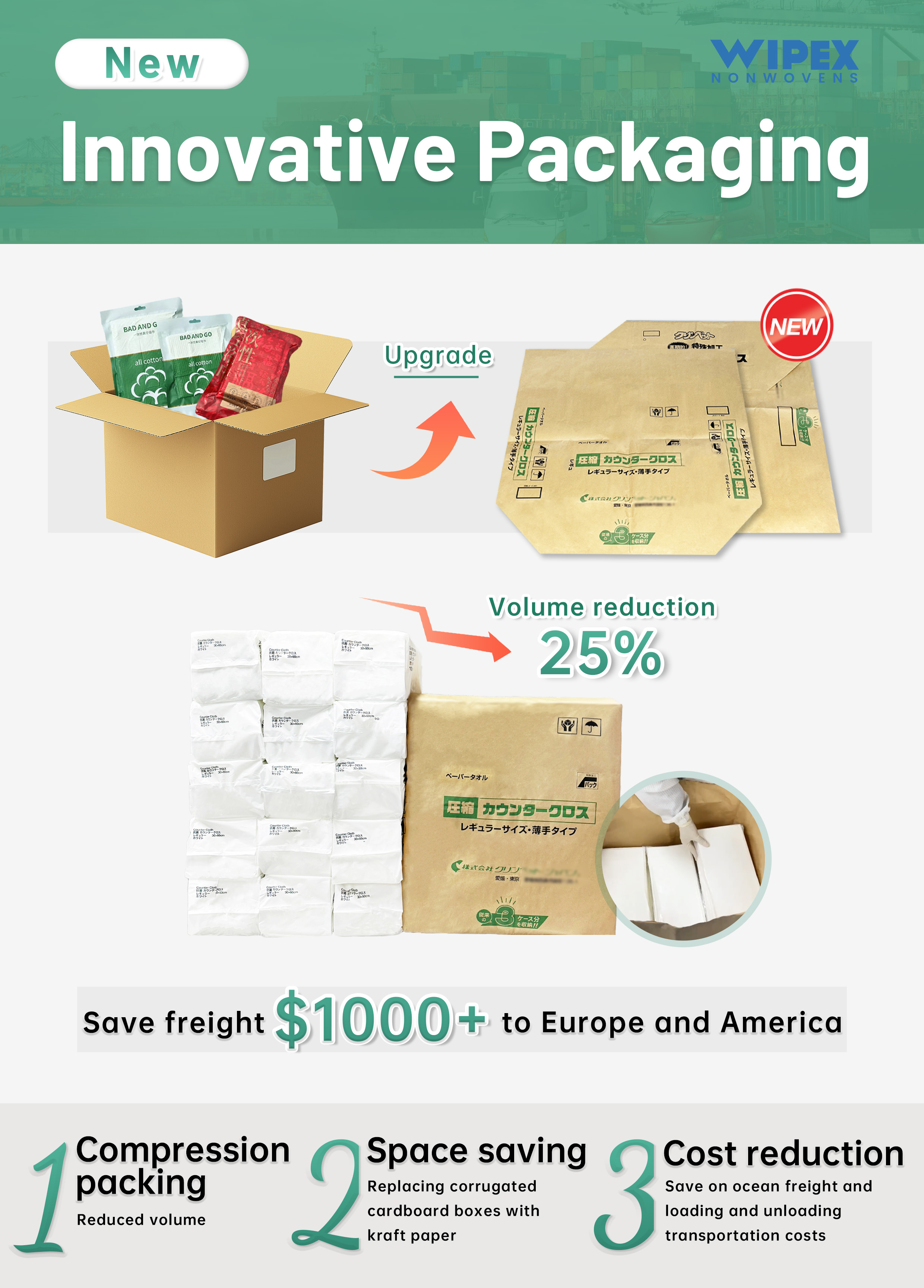 WIPEX is proud to announce the launch of our innovative environmentally friendly packaging system—Compression Packing —designed to significantly reduce shipping volume, cut costs, and support sustainable logistics. This new regular-size, thin-type packaging solution offers a remarkable 25% reduction in volume, delivering both economic and environmental benefits.